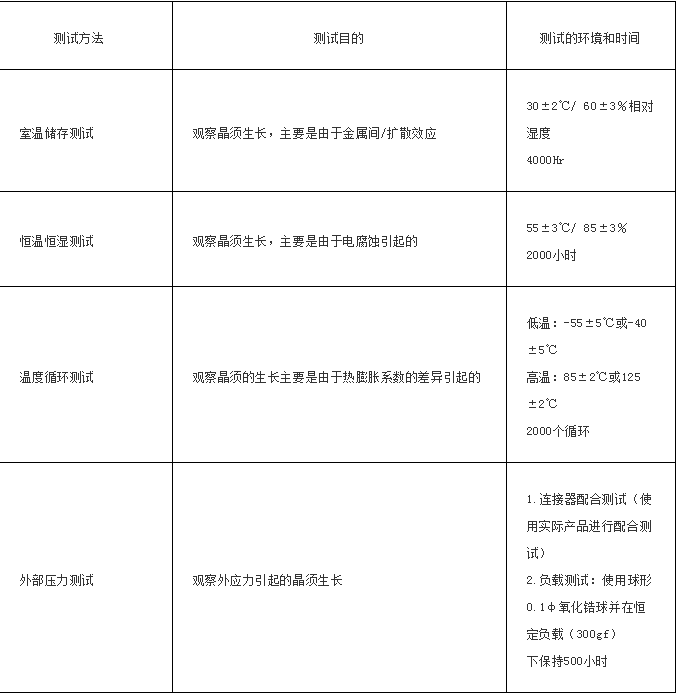 下表顯示了當(dāng)前大家正在研究的晶須測試方法和晶須發(fā)生情況。