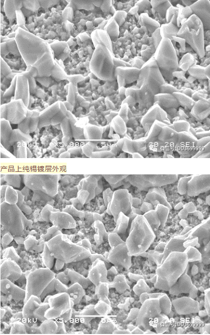 下面2張圖展示對比出了鎳和銅底鍍層之后鍍錫層的SEM觀察照片,在室溫20000Hr放置后對純錫鍍層的蝕刻。在使用鍍銅打底層的情況下,銅錫化合物沿著錫的晶界呈“駝峰”形狀生長,而使用鍍鎳層打底的則以薄箔的形式生長。