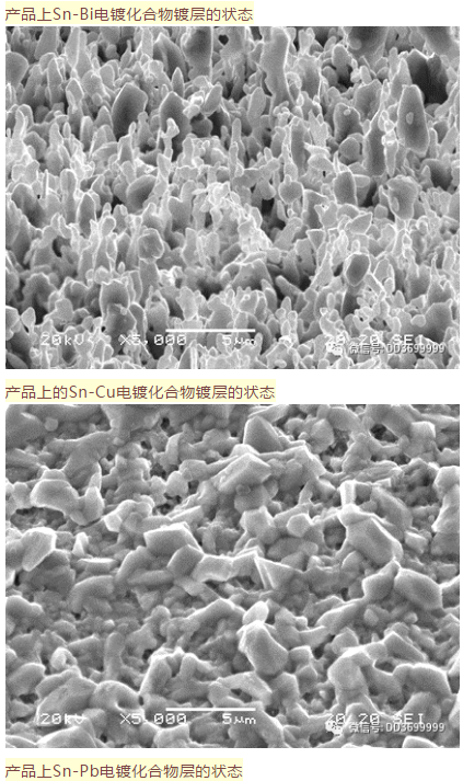 第二種金屬的添加顯示出Sn化合物生長的巨大差異。在Sn-Pb鍍層和Sn-Bi鍍層中,“駝峰形”化合物的粒徑小于Sn鍍層,在Sn-Cu鍍層中,其呈“柱狀”生長而不是“駝峰形”。您可以看到它們的運(yùn)行生長狀況。通過室溫存儲測試的結(jié)果表明:每種晶須的晶須控制效果均大于鍍純錫。另外,通過配合我們樂將團(tuán)隊(duì)第一點(diǎn)介紹的打底鍍層可以更進(jìn)一步改變Sn基鍍層的化合物形成狀態(tài)或擴(kuò)散行為,從而可以獲得更高的晶須抑制效果。